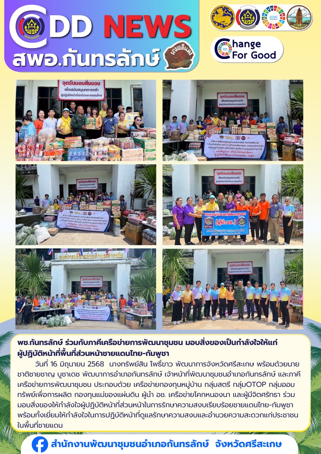 วันที่ 16 มิถุนายน 2568 นางทรัพย์สิน โพธิ์ขาว พัฒนาการจังหวัดศรีสะเกษ พร้อมด้วยนายชาติชายชาญ บูชาเดช พัฒนาการอำเภอกันทรลักษ์ เจ้าหน้าที่พัฒนาชุมชนอำเภอกันทรลักษ์ และภาคีเครือข่ายการพัฒนาชุมชน ประกอบด้วย เครือข่ายกองทุนหมู่บ้าน กลุ่มสตรี กลุ่มOTOP กลุ่มออมทรัพย์เพื่อการผลิต กองทุนแม่ของแผ่นดิน ผู้นำ อช. เครือข่ายโคกหนองนา และผู้มีจิตศรัทธา ร่วมมอบสิ่งของให้กำลังใจผู้ปฏิบัติหน้าที่ส่วนหน้าในการรักษาความสงบเรียบร้อยชายแดนไทย-กัมพูชา พร้อมทั้งเยี่ยมให้กำลังใจในการปฏิบัติหน้าที่ดูแลรักษาความสงบและอำนวยความสะดวกแก่ประชาชนในพื้นที่ชายแดน